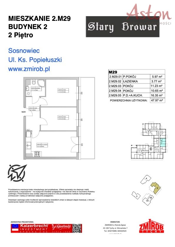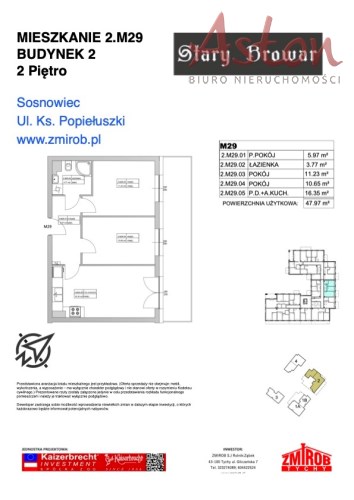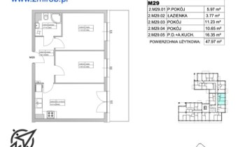 2M29 - mieszkanie o powierzchni 47,97 m2, 2 piętro, 3 pokoje, taras - 14,65 m2.
