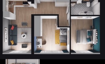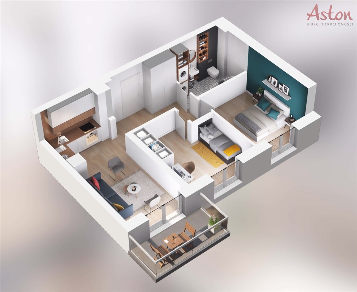 • Układ: Salon z aneksem kuchennym, dwie sypialnie, łazienka, przedpokój